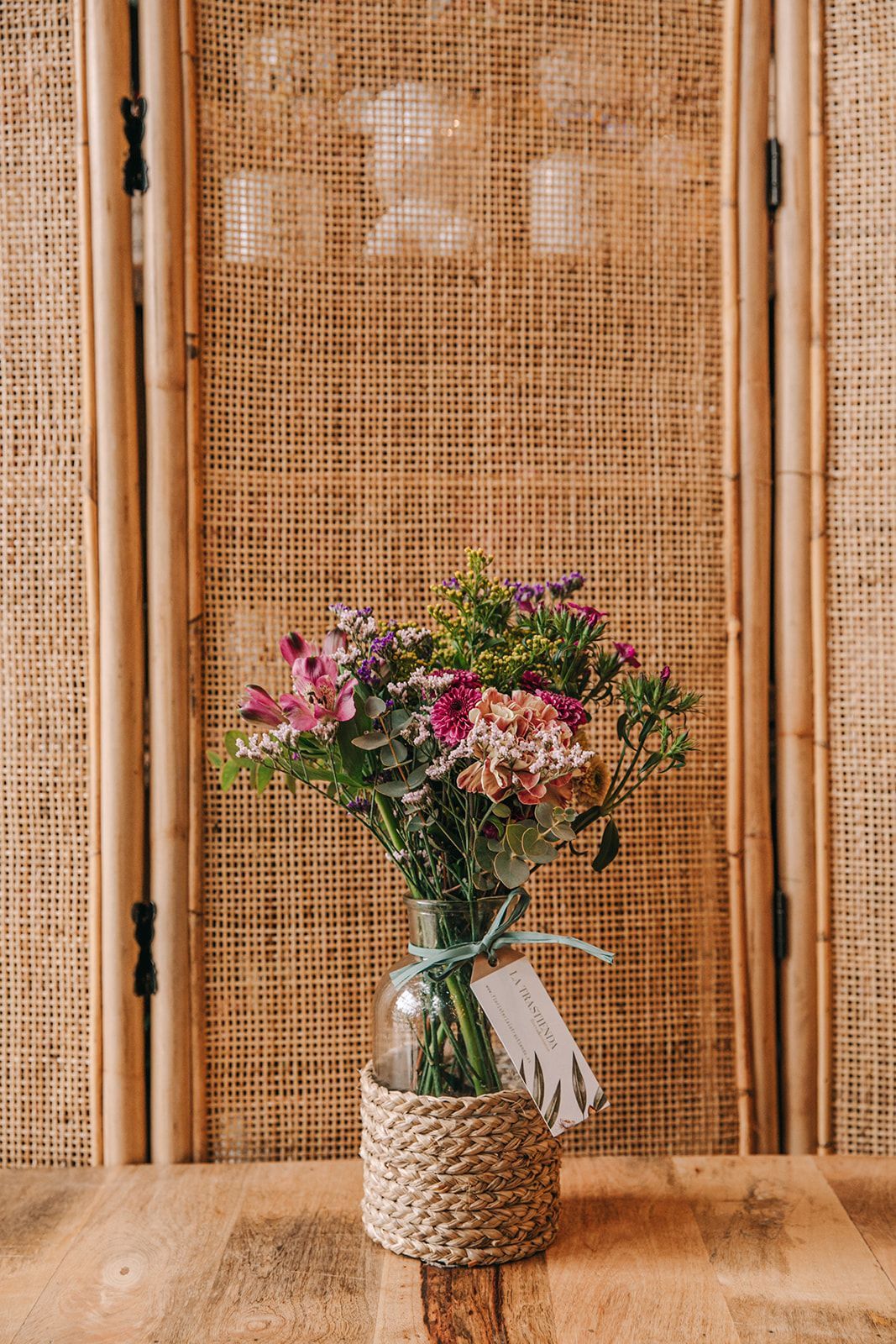 Este arreglo floral se realiza cuidadosamente con flores naturales seleccionadas según la temporada, lo que garantiza que cada pieza sea única y esté en sintonía con la estación del año. Se presenta en una botella de cristal adornada con detalles de enea, aportando un toque cálido, natural y decorativo.