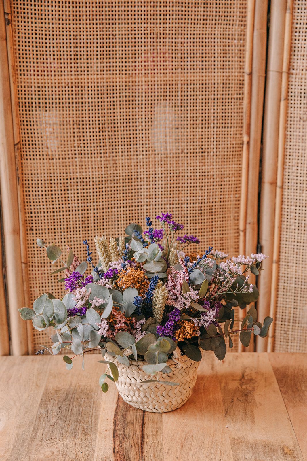 Encantador capazo de palma natural relleno de una cuidada selección de flores silvestres, combinadas con otras variedades para secar y preservadas. Un arreglo pensado para durar en el tiempo, manteniendo su belleza con el paso de los días.
