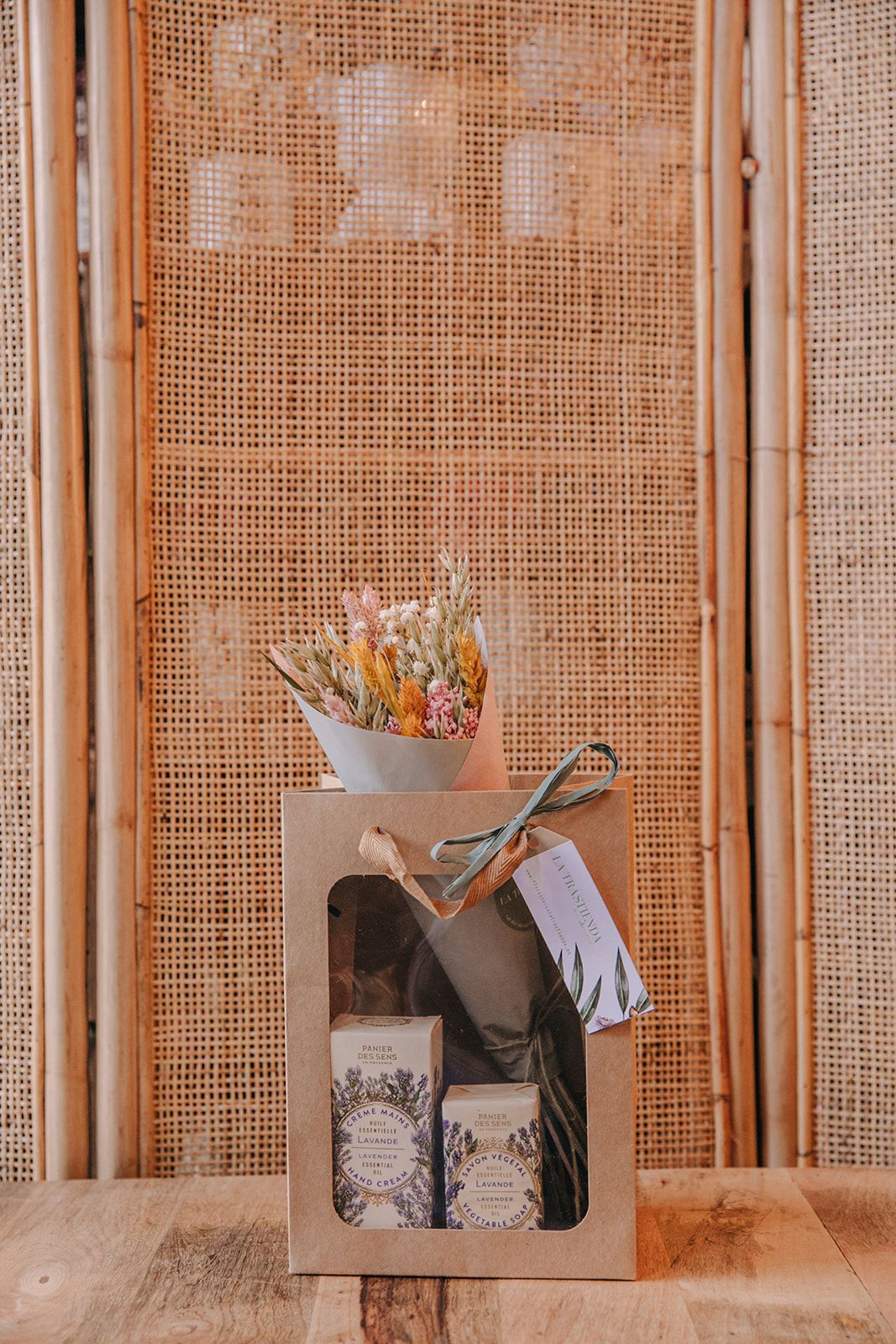 ack compuesto por un ramito de flor preservada acompañado de una crema de manos y un jabón artesanal, presentado de forma cuidada y con un aire natural y delicado.