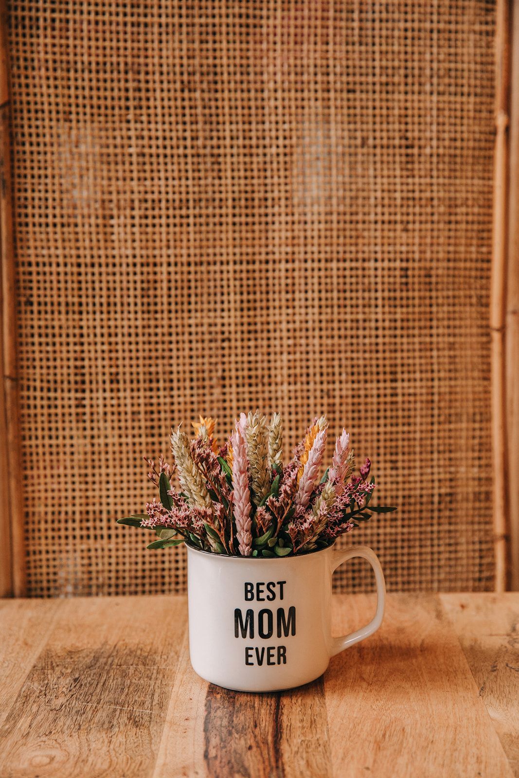 Taza con mensaje “La mejor madre”, acompañada de una pequeña selección floral que la convierte en un detalle tierno, bonito y lleno de cariño.